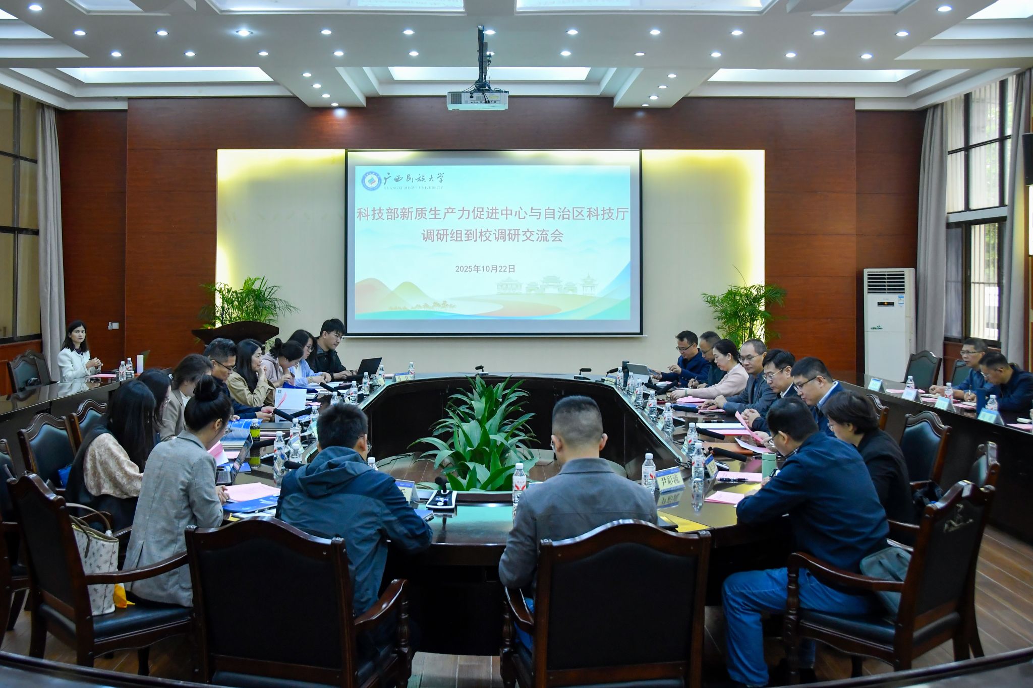 【大学生通讯社报道】10月22日上午,科技部新质生产力促进中心与自治区科技厅联合调研组到广西民族大学进行专题调研。调研座谈会在广西民族大学相思湖校区国际合作与交流处大会议室举行,学校党委常委、副校长高兴宇出席会议。