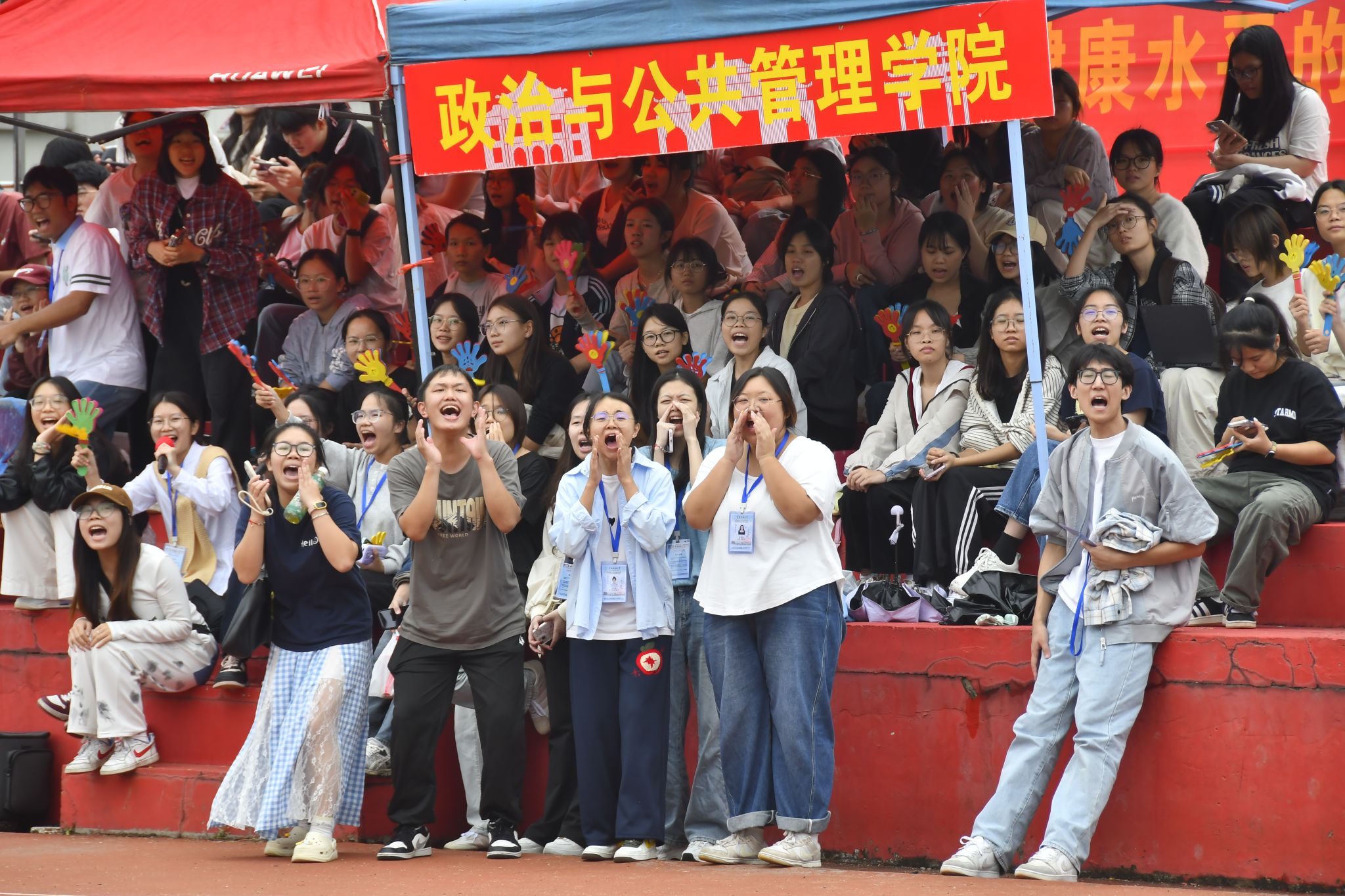 文学院2024级汉语国际教育印尼语专业的刘宣男,一身蓝衣,高举“文学院”的红色旗帜,在跑道边随运动员一同奔跑。那道蓝色身影与飘扬的旗帜,成为场边一道无声却有力的风景,鼓舞着每一位文学院选手。“我也是文学院田径队的一员,就想着在旁边陪着他们,给他们打气。”